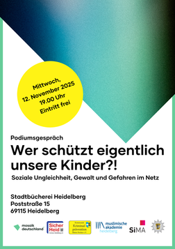 Am Mittwoch, 12.11.2025, um 19:00 Uhr, findet im Hilde-Domin-Saal der Stadtbücherei Heidelberg ein Podiumsgespräch zum Thema Soziale Ungleichheit, Gewalt und Gefahren im Netz, unter dem Titel "Wer schützt eigentlich...unsere Kinder?!" statt. Auf dem Podium nehmen Platz: