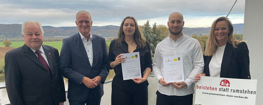 Für ihr aufmerksames und couragiertes Verhalten wurden drei junge Menschen aus Edingen und Mannheim, im Rahmen der Kampagne „Beistehen statt rumstehen“ im Rathaus Edingen-Neckarhausen geehrt. Der Bürgermeisterstellvertreter der Gemeinde Edingen-Neckarhausen, Herr Dietrich Herold, der Leitende Kriminaldirektor der Kriminalpolizeidirektion Heidelberg, Herr Ralf Krämer, und die Geschäftsführerin des Vereins Kommunale Kriminalprävention Rhein-Neckar e.V., Frau Tanja Kramper, nahmen die Ehrung vor.